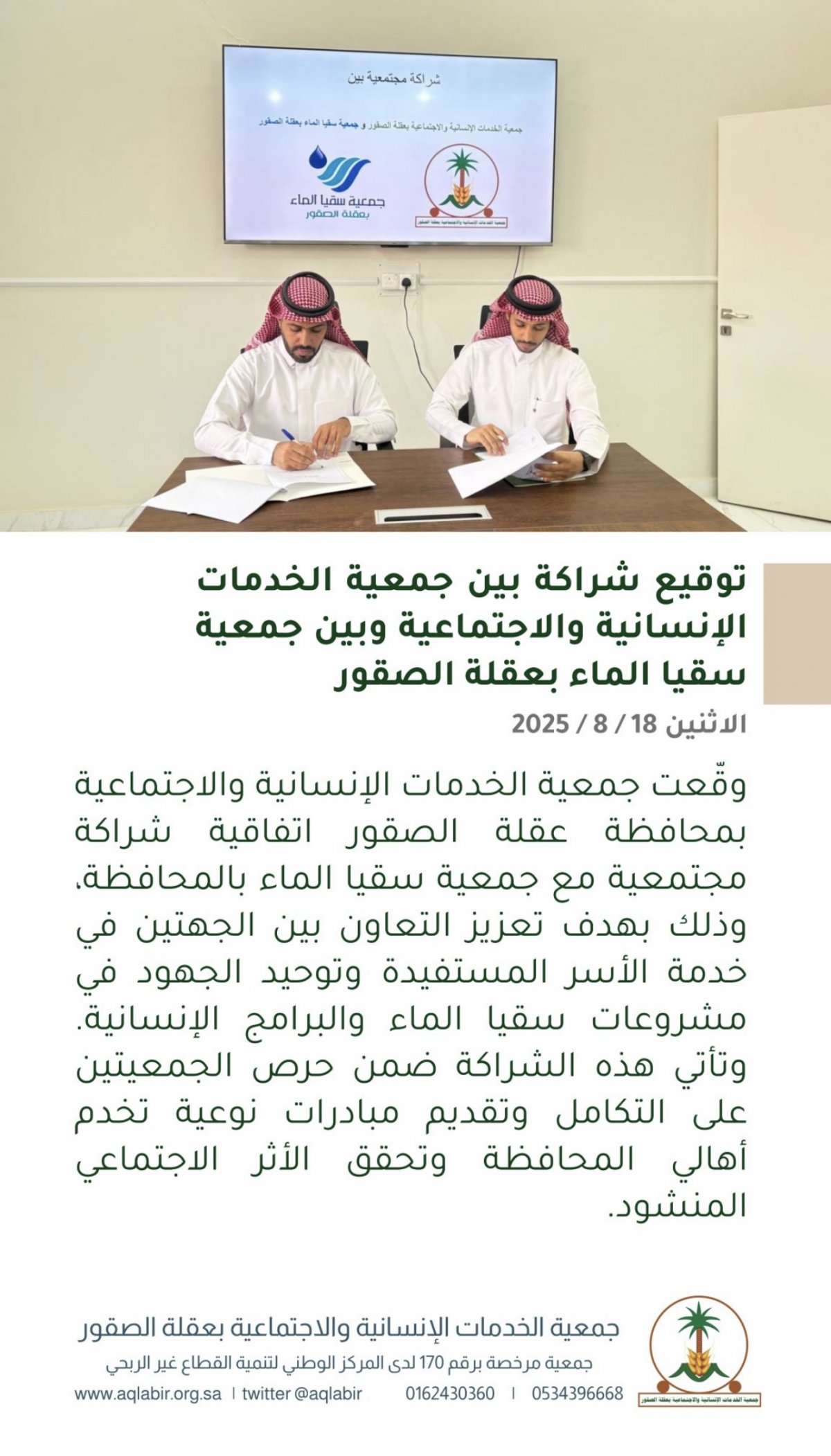 توقيع شراكة بين جمعية الخدمات الإنسانية والاجتماعية وسقيا الماء بعقلة الصقور